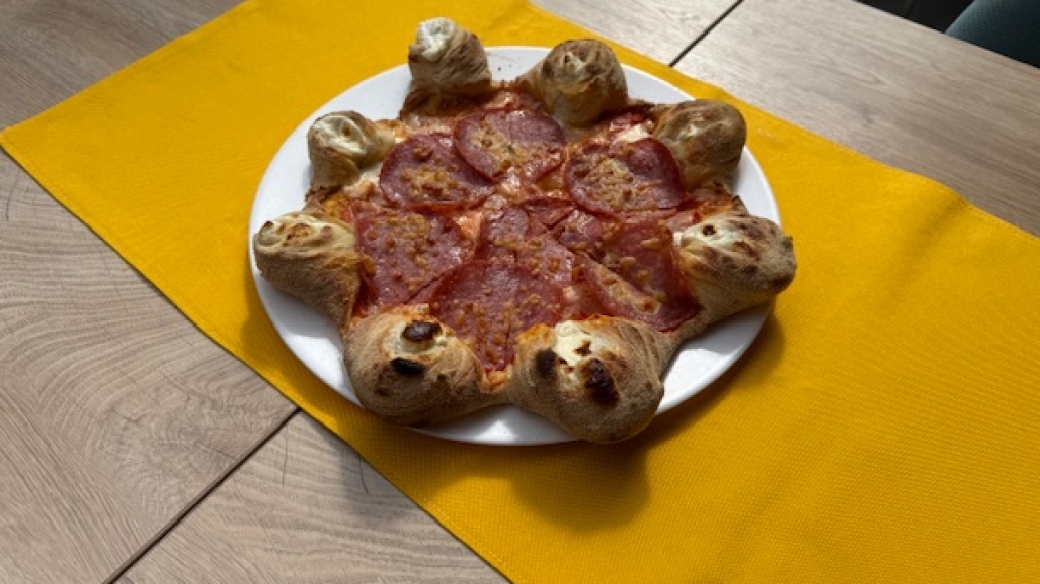 Sos de roșii, cașcaval afumat, salam, șuncă presată, mozzarella si crema de branza in colturi.